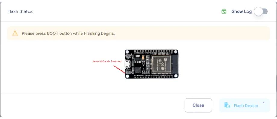 - A window will appear on the bottom right side of the screen displaying “Please press BOOT button while flashing begins.”