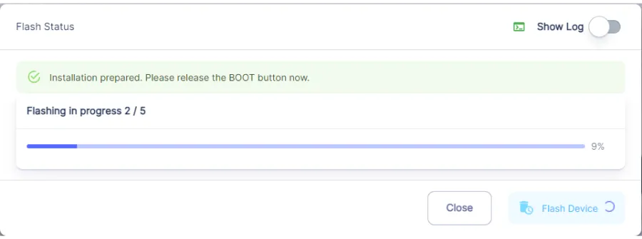 - Hold the BOOT button down until the next window appears on the bottom right side of the screen which says “Installation prepared. Please release the boot button now.”